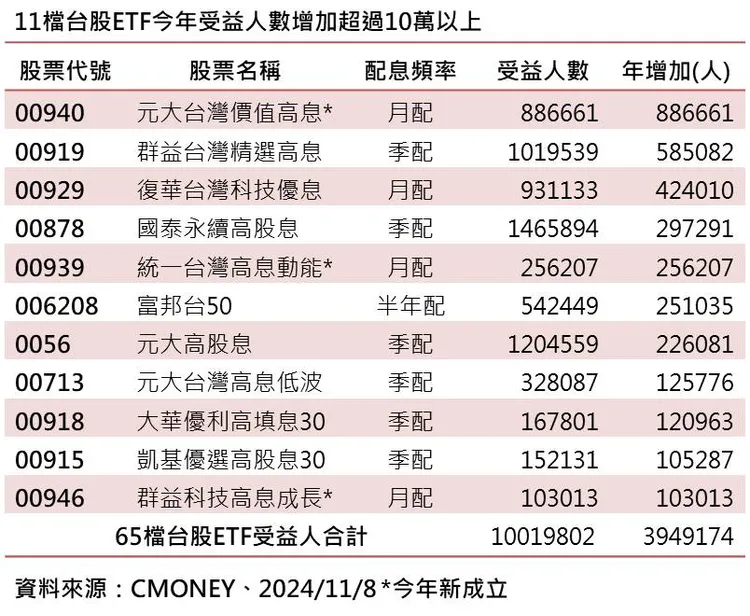 進一步觀察,今年來台股ETF人數增加394.9萬人,單檔來看,新成立的00940元大台灣價值高息人數88.6萬最多,若以淨增加人數來看則是00919群益台灣精選高息ETF增加58.5萬人最具人氣。整體來看,今年來受益人增加超過10萬人的有11檔,其中有10檔是高息型ETF,顯示出投資人最愛的台股ETF還是高息型。