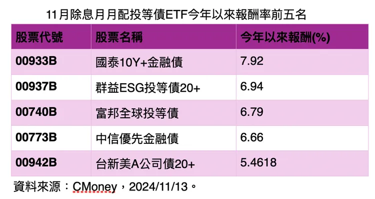 觀察11月除息的月月配債券ETF中,以投資等級債ETF較受到歡迎,成交較為熱絡;再進一步觀察今年以來累積報酬,前三名分別是國泰10Y+金融債00933B,報酬率7.92%、群益ESG投等債20+00937B,報酬率6.94%、中信優先金融債00773B,報酬率6.79%;其中就有兩檔是金融債ETF。