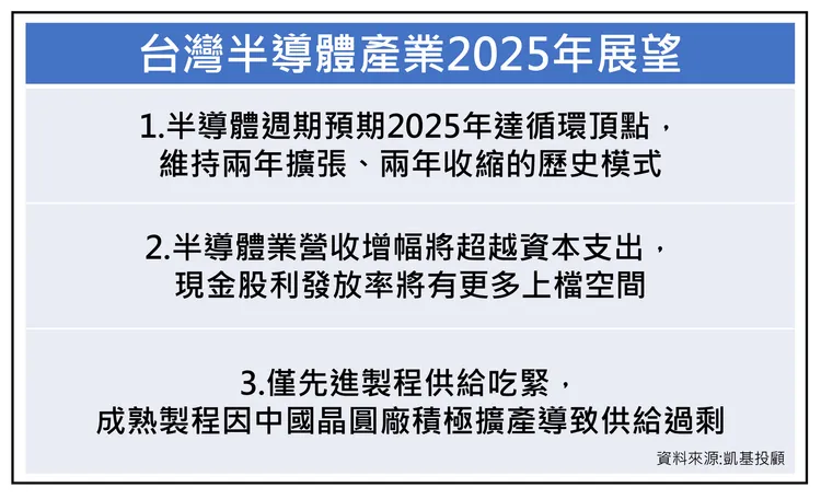 對於2025年半導體產業展望,凱基投顧提出3大重點:首先,半導體週期有機會於2025年達循環頂點,並維持過去十年多來「兩年擴張、兩年收縮」的歷史模式;其次,此次週期中半導體營收增幅將超越資本支出,亦即半導體業者的現金股利發放率將有更多上檔空間;最後則須注意,在各類製程中,僅先進製程供給吃緊,而台積電受惠於市佔率擴張與AI熱潮,在先進製程領域領先群雄;成熟製程方面則因中國晶圓廠積極擴產導致供給過剩,故仍陷於L型復甦。