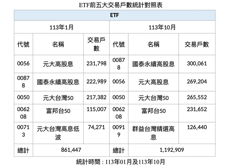 ETF部分,今年1月與10月前3大交易標的也相同,10月前3大交易標的交易戶數總計為834,817戶,較1月成長約24.20%。直得注意的是,1月定期定額戶數最多的ETF原本為老字號高股息ETF元大高股息(0056),10月已經被國泰永續高股息(00878)取代,並達到30萬戶關卡。