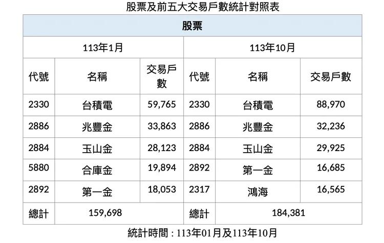 比較今年1月與10月的定期定額標的,股票部分,今年1月與10月前3大交易標的相同,10月前3大標的交易交易戶數總計為151,131戶,較1月增加24.13%。其中,台積電總交易戶數大增近5成,來到88,970戶。