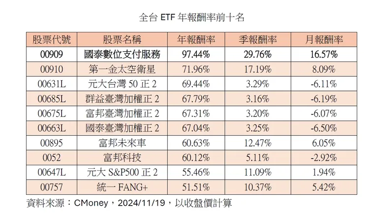 近一步剖析各項數據,00909的年報酬率、季報酬率、月報酬率,分別以97.44%、29.76%以及16.57%,奪下全台ETF報酬三冠王,表現更勝台灣掛牌的正2槓桿型 ETF。00909今年以來價格從22.43元,飆漲到34元水位,今天(20日)盤中更觸及34.81元,單日盤中漲幅已達2.87%,讓網友看了直呼,根本是ETF界的最狂飆股!