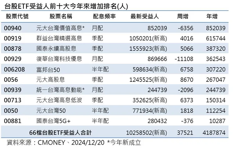進一步觀察前十大台股ETF受益人數同步創新高的有6檔,包括00919群益台灣精選高息ETF今年來增加61.5萬人最多,其他5檔分別為00878、006208、0056、00713、0050。其中,00878、00919、0056、00713等4檔季配息的台股高息ETF還是相對持續受到投資人熱愛,與0050、006208市值型ETF在受益人數表現同步創高。