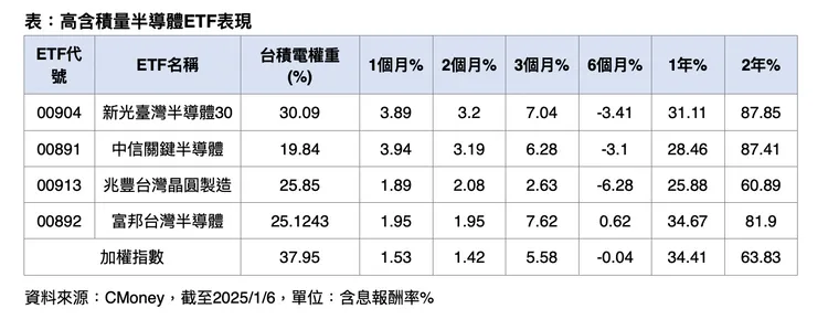 鎖定上述半導體潛力股的台股半導體ETF,1/6單日股價漲幅亦一馬當先,根據CMoney統計,1/6半導體ETF單日漲幅最大有新光臺灣半導體30(00904)、富邦台灣半導體(00892),分別上漲2.92%、2.83%,超越加權股價指數的2.79%。