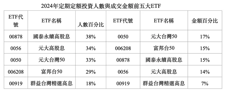 ETF方面,2024年定期定額投資人數以國泰永續高股息(00878)居冠、達38%,接著是老字號高股息ETF元大高股息(0056)34%,元大台灣50(0050)以33%拿下第三,富邦台50(006208)29%,群益台灣精選高息(00919)18%。成交金額則是以元大台灣50的17%拿下榜首,緊接著是富邦台50的15%,國泰永續高股息15%,元大高股息14%,群益台灣精選高息以7%居於第五。