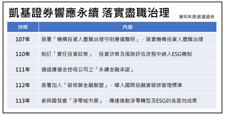 為接軌國際責任投資原則,凱基證券致力提供永續金融解決方案,自簽署「機構投資人盡職治理守則遵循聲明」後,公司迅速制訂「責任投資政策」,在投資決策及風險評估流程中納入ESG(環境、社會、公司治理)機制外,並藉由關注被投資公司營運狀況、出席股東會行使投票權及適當與被投資公司對話、互動等方式,積極落實盡職治理。同時因應全球去碳化趨勢,111年經董事會通過遵循金控母公司的「永續金融承諾」,隔年正式簽署加入「碳核算金融聯盟」,導入國際投融資碳排管理標準,建構氣候變遷風險管理機制,並遵循SBTi(科學基礎減碳目標)國際標準,以具體行動實踐全資產淨零碳排目標,藉此推動企業永續轉型,加速實現淨零排碳願景。