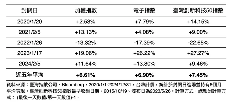 野村投信投資策略部副總經理但漢遠表示,若在封關日進場並持有至少六個月,加權指數的平均報酬率達+6.61%,換算年化報酬率高達+13.2%;而電子類股指數同期表現更佳,平均報酬率達+6.9%,年化報酬率達+13.8%。若聚焦創新科技族群,以「臺灣創新科技50指數」為例,六個月平均報酬率達+7.45%,年化報酬率接近+15%。但漢遠提醒,投資需衡量自身風險承受能力,過往數據僅供參考,指數報酬亦不等同基金績效。