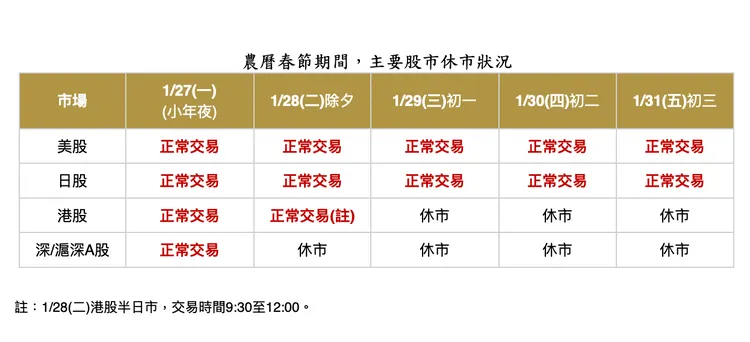 永豐金證券表示,今年台股封關日1/22,當天台股、期貨等電子平台均正常收單,接著迎來11天休市,直到2/3台股開紅盤日恢復交易。農曆年節期間國際市場仍持續交易,永豐金證券提供複委託網路交易及人工接單24小時服務不打烊,包括大戶投APP、新理財網等平台均持續提供複委託下單,「豐存美股」照常扣款。「豐存台股」1/23-2/3之扣款約定,順延至2/3合併計算扣款,若存股族想調整約定內容,請於1/22下午五點前完成。