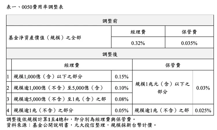 0050調整前費用率為經理費0.32%、保管費0.035%,未來將依規模調整。實際調整釋例:據證交所資料,至1月22日0050規模為4,469億,計算經理費之方式為1,000億先調整為0.15%,再針對規模逾1,000億元至5,000億元部分(即4,469-1,000=3,469億)調整至0.10 %。未來規模成長至逾5,000億元至1兆元、逾1兆元部分,將再分別調整至0.08%、0.05%;保管費採相同架構,現階段4,469億調整為0.03%,未來規模若超過1兆元部分再調整至0.025%。