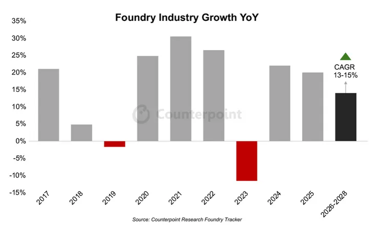 調研機構Counterpoint Research分析,晶圓代工產業將在2025年挑戰20%的營收成長,其中AI需求持續強勁,為台積電等主要業者帶來顯著助益。此外,消費電子、網通設備與蜂網等非AI區塊的需求回溫,也將支撐市場成長,進一步強化產業的長期潛力。