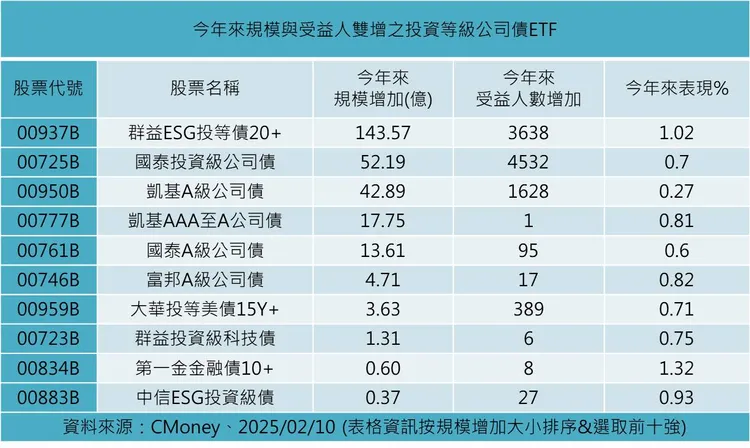 進一步分析今年來投資等級公司債ETF買氣概況,包含今年才募集與掛牌的00980B在內,規模與受益人數俱增的產品共計有14檔,以00937B規模增加143.57億元最多,也是整體債券ETF中買氣最旺的產品,且其受益人數增加與績效表現同樣表現突出。