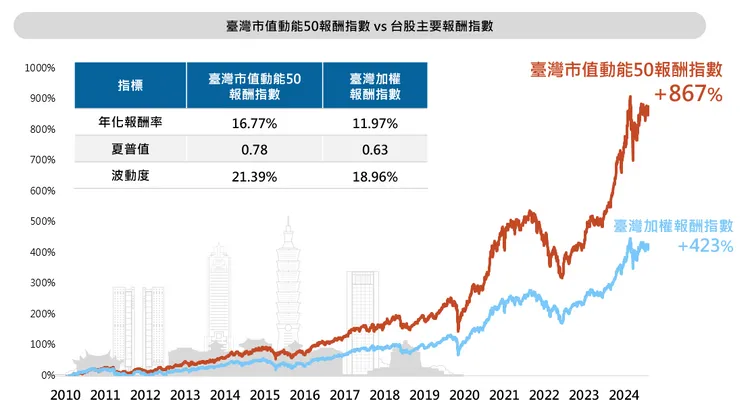 累積報酬方面,臺灣市值動能50指數表現優於加權指數。張芷菱指出,2010年5月至2024年底,該指數累積報酬率達867%,年化報酬率16.77%,明顯優於同期加權指數的423%及11.97%年化報酬率,凸顯市值成長動能選股策略的優勢。
