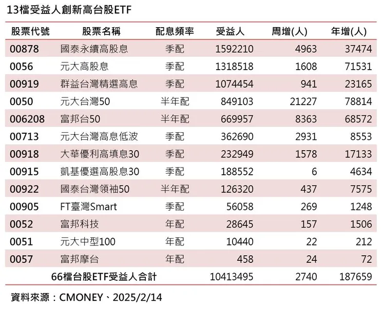 進一步觀察,這13檔中有6檔是高息型,5檔市值型,1檔產業型,整體來看,高息型略勝一籌市值型,另外季配型高息ETF還是相對月配型的受投資人喜愛。