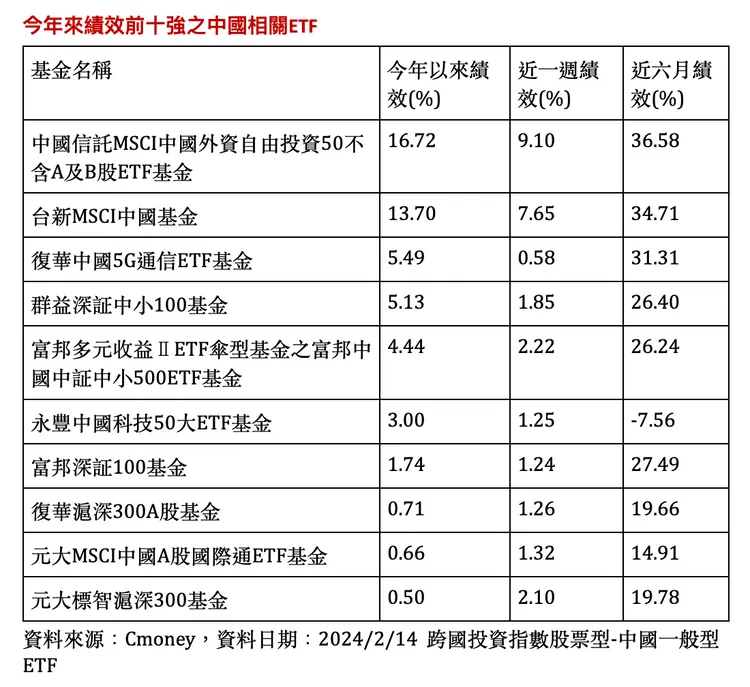 展望陸股後市,台新MSCI中國ETF(00703)研究團隊表示,根據高盛最新報告,預計人工智慧的廣泛應用,將會使得中國企業的每股盈利在未來10年每年提高2.5%,將MSCI中國指數的未來12個月的目標價,提升至85點,預計上漲空間為16%。投資人可挑選追踪MSCI中國指數之中國ETF,該指數成份股包括香港國企股、美股掛牌中企(ADR)和具滬港通或深港通資格的A股,適合投資人建立長期核心配置,藉此完整參與中國市場的成長與變化。