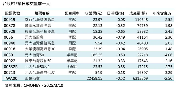 市場法人表示,00919的股性相對比較活潑,可創造很多見綠加碼、增加股數、降低成本的機會,00919最新配息公告0.72元維持新高,預估年化配息率12.11%,為連續8季衝破10%,除息日為3月 18 日,參與除息最後買進日為3月17日。