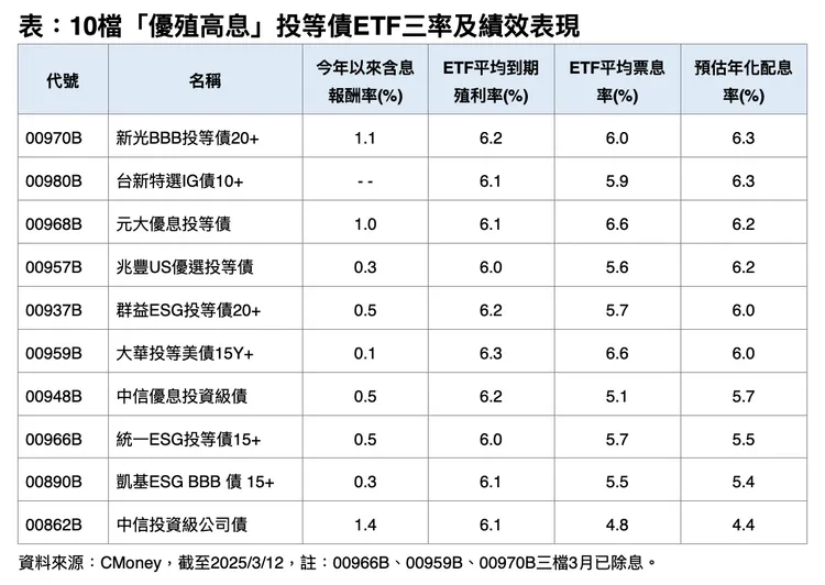 根據CMoney統計至3/12為止,今年3月以來,將有42檔債券相關ETF展開除息,如果考量到殖利率、票息率及年化配息率等量化條件,共有10檔「優殖高息」投等債ETF出線,其中,新光BBB投等債20+(00970B)、元大優息投等債(00968B)與大華投等美債15Y+(00959B)3檔投等債ETF,根據3/12收盤價計算,不論在殖利率、票息率或年化配息率等,皆有達到逾6%以上的水準,若再觀察今年以來績效,新光00970B、元大00968B、大華00959B這3檔,年初以來含息表現也為正報酬,整體息利表現較為突出。