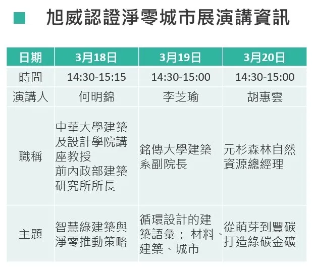 3月20日下午特別邀請元杉森林自然資源總經理胡惠雲分享「從萌芽到豐碳打造綠碳金礦」及19日銘傳大學建築系副院長李芝瑜介紹「循環設計的建築語彙:材料、建築、城市」和18日中華大學建築及設計學院講座教授(前內政部建築研究所所長)何明錦解析「智慧綠建築與淨零推動策略」,場場精彩。