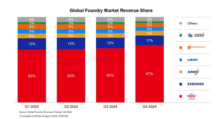 三星晶圓代工方面,2024年第四季營收季減,市佔率從12%降至11%。主因安卓智慧型手機需求不如預期,加上低產能利用率與高額研發費用壓縮營運表現。儘管短期承壓,三星仍持續投資AI與HPC業務,並計畫2025年量產2奈米GAA製程,以提升長期競爭力。