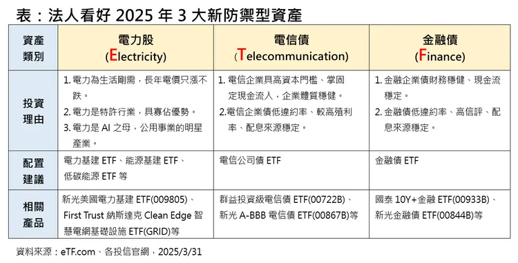 隨全球面臨匯率戰、科技戰再起、美國經濟衰退等3大利空壓抑,後市不排仍有震盪可能,展望第二季資產配置方向,投信法人表示,第二季全球投資主軸建議由攻轉守,預估避關稅衝擊兼抗通膨的美國內需型產業將起,包括股票型的美國電力股(Electricity)、債券型的電信債(Telecommunication)及金融債(Finance)等,將是未來3大新防禦投資首選,透過股債均衡配置,有望渡過川式震盪黑暗期。