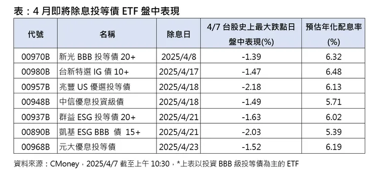 根據各投信官網統計,從本周起,將有7檔月配息債券ETF展開除息,新光BBB投等債20+ETF(00970B)率先打頭陣,4/7為除息最後買進日,正好遇上台股史上大跌點日,券商財富管理主管表示,面對川普關稅利空,建議回歸到ETF長線投資的本質,行情波動之際先減少槓桿操作,資金可轉向月配息債券ETF,挑選具穩定配息的投等債ETF,趁股價順勢回檔之際進場,反而有機會掌握更佳的配息報酬。