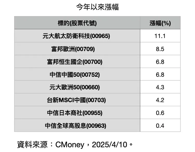 觀察今年以來歷經市場亂流,在4/10大補血後,也僅有8檔股票ETF繳出正報酬表現,元大航太防衛科技(00965)上漲11.07%位居第一,接續的富邦歐洲(00709)、富邦恆生國企(00700)、中信中國50(00752)漲幅則落在8.5%至6.6%。