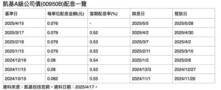 凱基A級公司債(00950B)自掛牌以來,已完成六次配息,每單位配發金額落在0.08元上下游走,基金配息當期殖利率落在0.52%~0.55%之間。當前關稅政策與聯準會利率決策仍相互拉扯,在關稅戰影響明朗化之前,中天期高評級信用債可望雙向因應信用風險與利率風險,可做為資產配置防禦部位的極佳選擇。