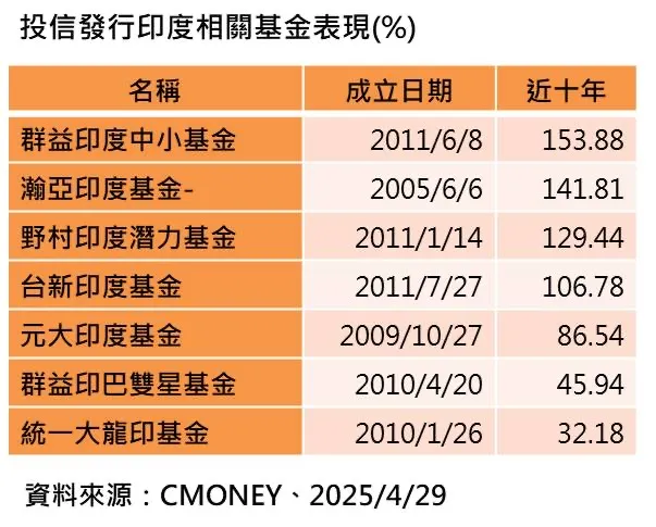 進一步觀察投信發行印度基金超過10年的有7檔,以近十年績效表現來看,群益印度中小漲幅154.42%表現居冠。市場法人表示,印度股市雖難逃川普之亂表現震盪,不過今年來仍維持上漲2.75%,實屬不易,印度具備基本面改善、政策加持等優勢,仍是深具投資價值的好標的。