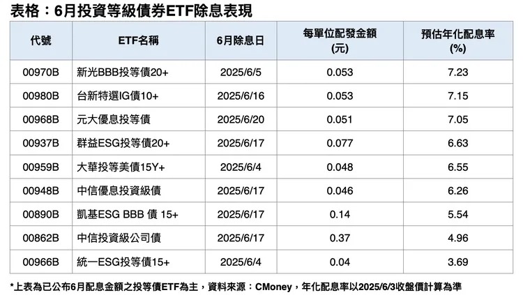 從CMoney統計資料來看,6月將有39檔債券ETF上演除息秀,以年化配息率來看,現階段受到美債表現不佳影響,隨著投等債ETF價格回落,年化配息率反而創新高,尤其是具穩定配息的月配型債券ETF,例如安全、收益兼顧的BBB級債,今年以來市場交投買氣佳,一直是不少機構法人及存債型投資人的菜,特別是ETF除息前夕,往往會吸引一波資金湧向BBB級投等債ETF參與除息,預估隨著投等債ETF價格順勢拉回,將吸引更多逢低買盤卡位BBB級債券ETF。