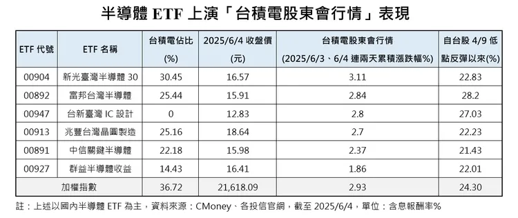 根據CMoney統計,台股在台積電6/3股東會後,6/4再度上演拉積盤表現,看國內6檔半導體ETF股價表現,以6/3、6/4連續兩日收盤累積報酬來看,新光臺灣半導體30 ETF(00904)累積上漲3.11%最高,領先加權股價指數的2.93%,其次是富邦台灣半導體(00892),兩天也上揚2.84%,至於其他半導體ETF兩天來股價也跟漲,法人分析,台積電股東會後,首度由董事長魏哲家主持,魏董扮演半導體行情最佳救援投手,不僅逐一化解股東及投資人疑慮,魏哲家還明確指出,維持對今年營收展望的預估,而未來幾個月,也許情況會更清晰,台積電魏董一番話成半導體行情定心丸。