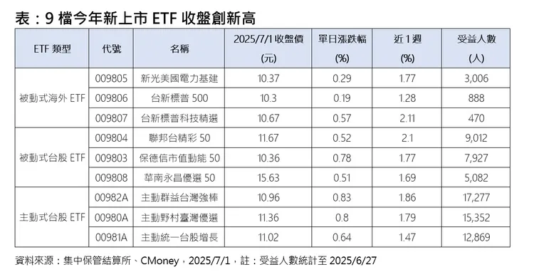 根據CMoney統計,今年以來新掛牌主、被動式股票型ETF多檔15檔,不少檔ETF歷經上半年4月關稅衝擊、5月通膨隱憂、6月以伊戰火肆虐,與新掛牌贖回賣壓打擊後,截至7/1止,共有9檔ETF股價創掛牌以來新高,其中,包括新光美國電力基建(009805)、台新標普科技精選(009807)追蹤指數與美股電力、科技類股相關,連續2天收盤價創上半年掛牌以來新高;另外,今年新上市的台股主、被動ETF股價近期表現不俗,分別有3檔被動式與3檔主動式ETF股價續強。