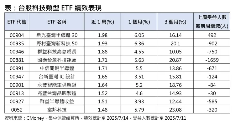 根據CMoney統計,近1周台股科技類型ETF績效表現翻紅,漲幅最高的前10檔ETF中,與半導體相關即佔5檔,其中,又以新光臺灣半導體30(00904)表現突出,近1周、1個月績效在同類型ETF表現名列前茅,且上周00904受益人數也較前1周呈淨成長,績效及市場買氣雙雙表現亮眼。