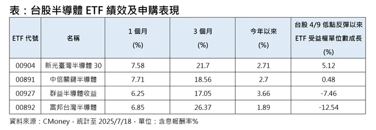 券商財富管理主管分析,上半年主動式ETF加入市場後雖提供更多產品選擇,但因成立時間尚短,績效未顯著突出。相較之下,具備配息機制、且聚焦半導體主題的季配型ETF更受青睞,特別是投資人可趁盤勢回檔、ETF折價時進場佈局,有機會卡位下半年「法說+填息」雙行情。