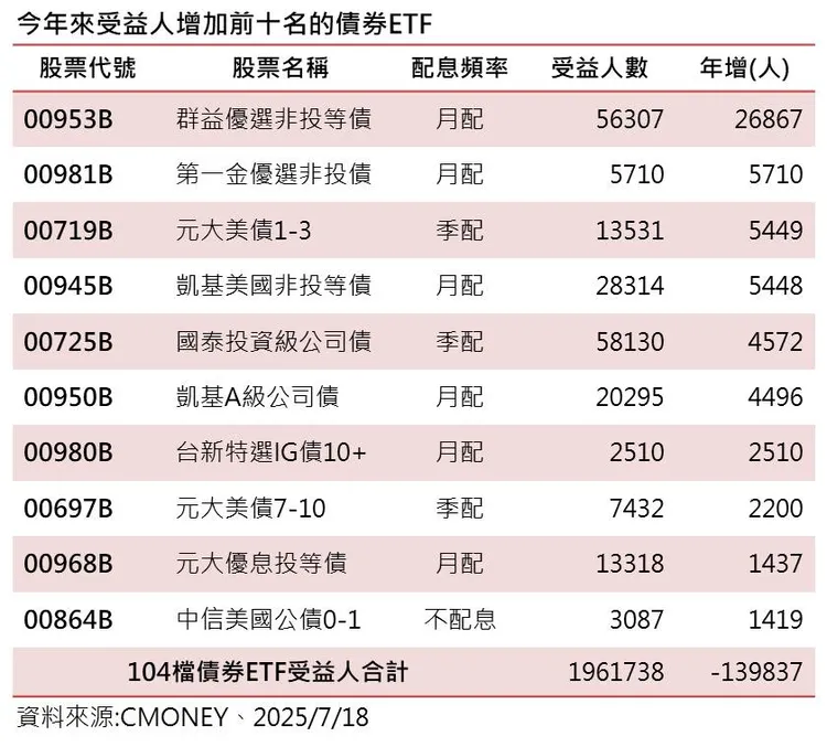 進一步觀察,今年來受益人逆勢成長的債券ETF共有34檔,整體來看以非投等債最受投資人喜愛,其次是短債,其中今年來更以00953B群益優選非投等債增加26867人人氣最旺,也是唯一一檔增加人數超過萬人的債券ETF。