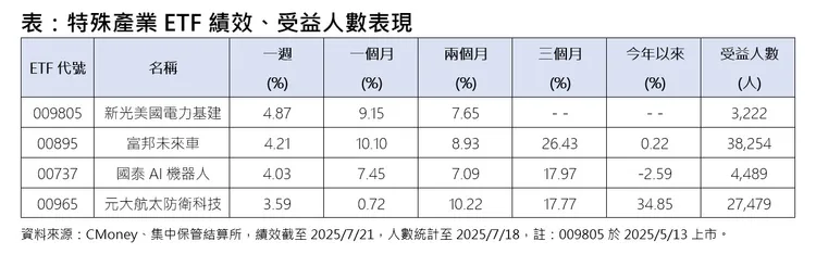 新光投信表示,在基本面與政策雙引擎帶動下,投資人可透過追蹤電力基建、機器人、智駕車與航太科技等特殊產業的ETF進行中長線布局,掌握AI紅利擴散所帶來的新一波股價輪動機會,尤其適合追求長期資本增值的策略型投資人。