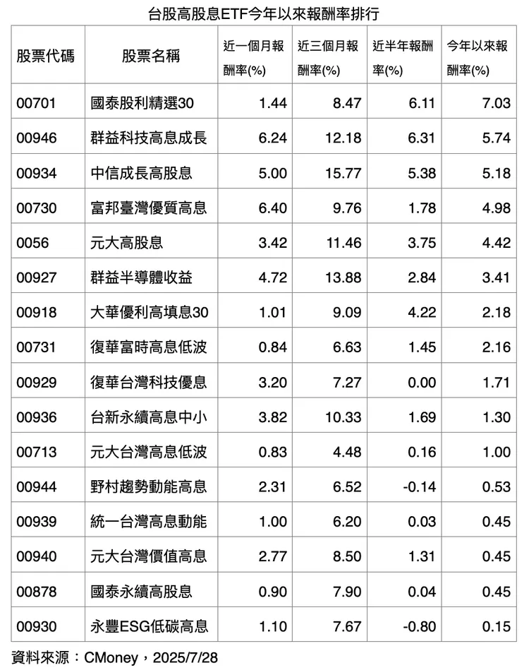 綜觀台股高股息ETF,截至目前為止,共有16檔今年績效翻正。含息總報酬率前三名分別為國泰股利精選30(00701)、群益科技高息成長(00946),以及中信成長高股息(00934)。若以近一季來看,則以00934的15.77%報酬率最佳,凸顯對等關稅發生以來,高股息ETF中最佳的修復力。