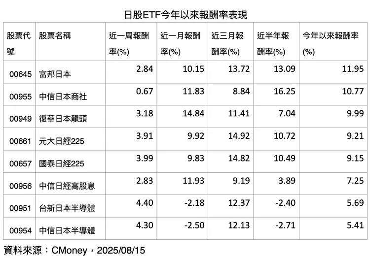 日股持續創高,也激勵日股ETF表現,今年以來日股ETF績效全面翻正,截至8月15日止,富邦日本(00645)今年以來報酬11.95%居首,其次為中信日本商社(00955)的10.77%,第三為復華日本龍頭(00949)的9.99%。同時,00955受益人數今年以來大幅成長逾200%,顯示在股神巴菲特加持下,人氣明顯領先。
