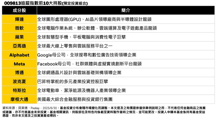 009813基金經理人楊貽甯表示,009813聚焦標普500中市值前50大企業,成分股涵蓋資訊科技、通訊服務、金融、消費、醫療保健等核心產業,入選企業皆為全球產業領導者,包括輝達(Nvidia)、蘋果(Apple)、微軟(Microsoft)、亞馬遜(Amazon)、Meta與特斯拉(Tesla)等,堪稱美股全明星陣容。以產業比重來看,資訊科技高達46%,通訊服務與金融則分別占15%與11%,充分反映美國當前經濟成長的主要動能。