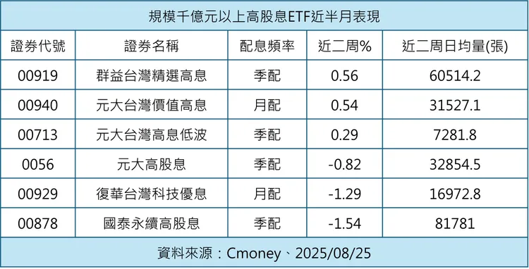 市場法人認為,高股息ETF具有低波動特性,又可兼顧穩健收益需求,因而重獲投資人的青睞,近期交投有逐步增溫跡象。進一步觀察6檔規模千億元以上的高股息ETF 近半月來的績效表現,群益台灣精選高息(00919)、元大台灣高息低波(00713)、元大台灣價值高息(00940)3檔繳出正報酬,其中00919的含息報酬率達0.56%,表現居冠,展現高息型ETF攻守兼備的優勢。