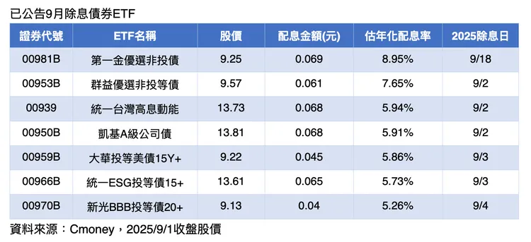 目前已公告9月份除息債券ETF中,仍然以非投資等級債券ETF表現領先,如:第一金優選非投債ETF(00981B)、群益優選非投等債(00953B)等,年化配息率高達7%至9%。