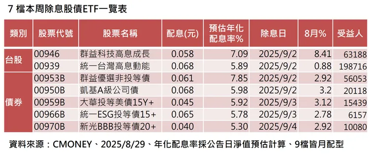 財富管理專家表示,觀察這7檔將除息的ETF8月份績效表現,以00946上漲8.41%表現最佳,彰顯出科技高息ETF的跟漲抗震特性。據了解,00946第14次最新公告配息從上一次的0.025元上調至0.058元,掛牌以來已連續14次配息,且先前13次都完成填息任務,讓投資人息利雙收,最值得投資人留意投資契機。而隨著利率偏下行走勢,將持續有利債券價格走升,其中非投資等級債券更是受惠,投資人可把握相關債券ETF投資契機。