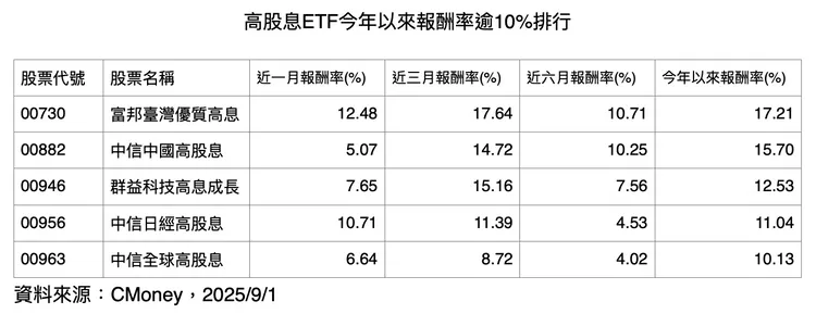 緊接在後的還有群益科技高息成長(00946)的12.53%、中信日經高股息(00956)的11.04%,以及中信全球高股息(00963)的10.13%。值得注意的是,今年表現超過10%的ETF中,有三檔來自海外市場,分布於中國、日本與歐洲,反映去年台股高股息ETF獨強的格局已不再。