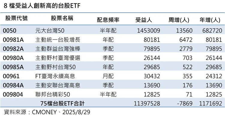 進一步觀察台股ETF受益人單檔表現,包括元大台灣50(0050)、主動群益台灣強棒(00982A)在內共8檔受益人數逆勢創高。整體表現來看,包括00982A在內的5檔主動式台股ETF受益人數全數創高,顯見出台股主動式ETF已然成為投資人新寵。市場法人表示,主動式ETF選股可視市場變動操作靈活優勢提前佈局相關概念股,投資人可多利用台股主動式ETF介入台股。