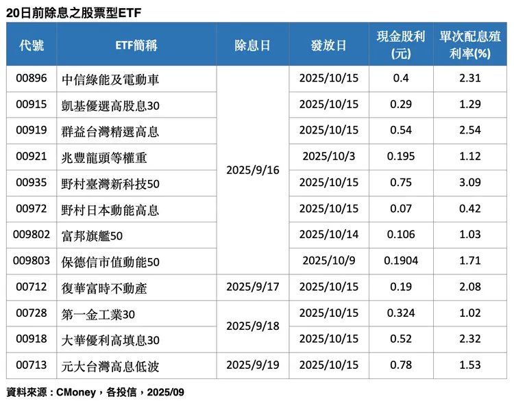 目前已公告9月20日前除息的股票型ETF多為台股ETF,包括首次參與配息的保德信市值動能50、富邦旗艦50兩檔台股ETF新兵,以及投資人熟悉的群益台灣精選高息、大華優利高填息30等。以保德信市值動能50與富邦旗艦50兩檔ETF新兵比較,前者首次季配息0.1904元,配息率約1.71%,後者同樣為季配息台股ETF,本次配息0.106元,配息率1.03%。