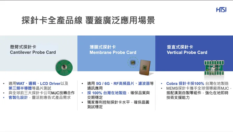 漢測總經理王子建指出,公司是台灣唯一能自主研發與製造薄膜式探針卡並提供整卡解決方案的廠商,具備設計、製造到應用完整服務能力,並於南科設立薄膜式探針卡廠,將以此為主力產品。另與全球前三大探針卡廠商 MJC 策略合作,入股漢測6%股權,加強導入 MEMS 技術,提升效率與降低成本。公司也積極投入材料創新及矽光子晶圓測試等前瞻領域,強化市場競爭力。