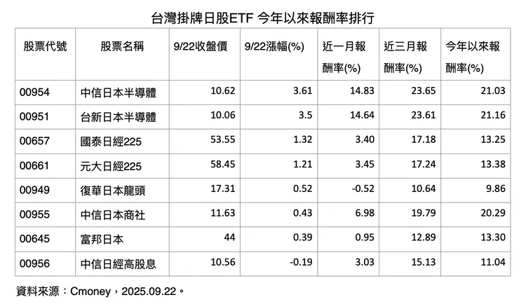 目前台灣共有8檔日股原型ETF掛牌,其中以半導體相關ETF漲勢最為凌厲。在美國降息循環與先進製程持續推進的帶動下,日本半導體類股強勢上攻,使台新日本半導體(00951)、中信日本半導體(00954)等ETF近一個月漲幅超過14%,今年以來的報酬率更突破21%,榮登今年表現最佳的日股ETF。