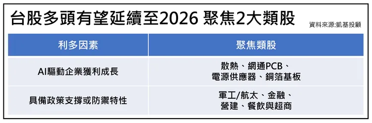 在選股策略上,凱基投顧建議投資人聚焦散熱、網通PCB、電源供應器、銅箔基板等具規格升級動能的次族群,並於修正期間分批布局。同時,因非AI股基本面較弱,建議鎖定具政策支撐或防禦特性的產業,如軍工航太、金融、營建、餐飲與超商,以分散風險並強化投資組合穩健度。