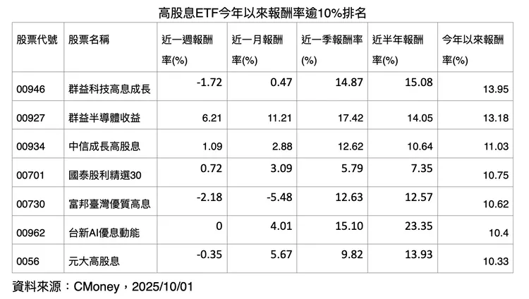 高股息ETF在9月表現分歧,主因在於選股策略差異。聚焦半導體的產品表現亮眼,00927單月大漲9.13%,漲勢直追市值型ETF;00946與00934則因科技與半導體設備股比重高,第三季漲幅同樣驚人,分居高股息ETF績效冠、季軍。00934更宣布本次擬配息0.098元,年化配息率上看6%,改善去年以來月配息不穩定的印象。