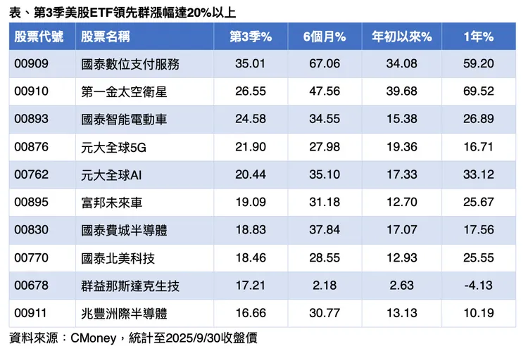 整體來看,第三季美股 ETF 漲勢集中在政策加持與創新科技驅動的產業,包括數位支付、太空衛星與 AI,帶動資金強力湧入。專家提醒,投資人若看好長期科技浪潮,可留意具成長力與主題趨勢的 ETF,搭上政策與產業升級的雙重利多。