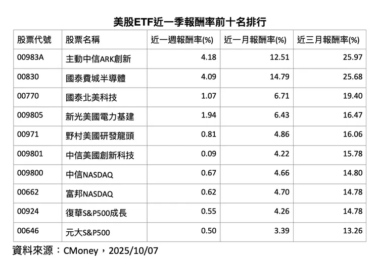 值得關注的是,今年6月掛牌的主動式ETF「中信ARK創新」(00983A)異軍突起,聚焦AI、自駕車、區塊鏈等五大顛覆式創新產業,近一季報酬率達26%,表現甚至優於費半指數,成為今年美股ETF市場的最大黑馬。