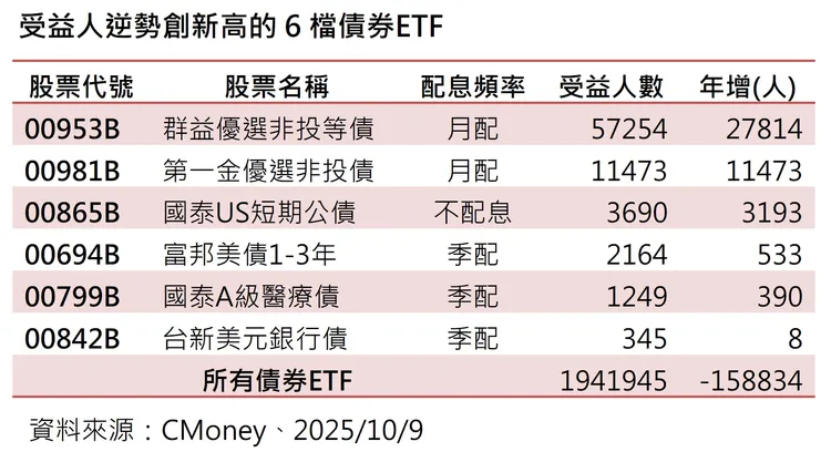 不過,仍有6檔ETF逆勢創高,包括群益優選非投等債(00953B)、第一金優選非投債(00981B)、國泰US短期公債(00865B)、富邦美債1-3年(00694B)、國泰A級醫療債(00799B)、台新美元銀行債(00842B)。其中,以群益優選非投等債(00953B)增加27814人人氣最旺,也是唯一一檔增加人數超過2萬人的債券ETF。這6檔受益人逆勢創高的債券ETF,前兩名都是非投等債,整體來看非投等債最受投資人喜愛。